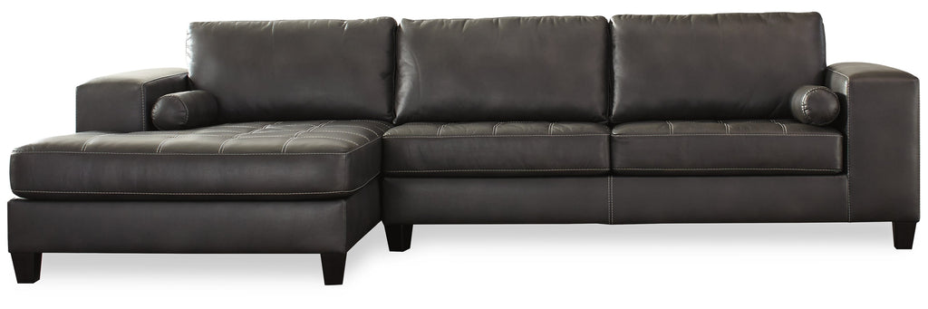 The word "plain" is not in this sectional's vocabulary. Low back seating and wide track arms make it ultra cool. Just enough soft padding in all the right places makes it handsome and sleek. Charcoal color faux leather with an embossed natural grain effect and matte finish is inspired by contemporary euro leather. Light gray stitching adds contrast, and tufting on the seats puts this set in a league of its own.