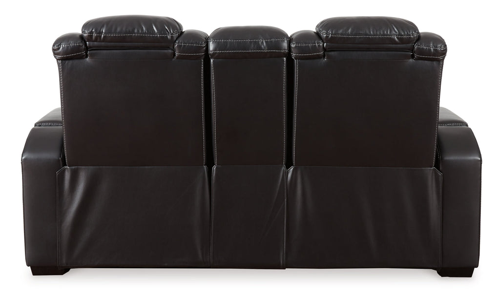 This power reclining loveseat takes its cue from luxury automobiles with lattice- and cross-hatch stitching, for a richly tailored aesthetic that gives you plenty of reasons to celebrate. Sumptuously padded cushions and dramatic midnight black faux leather upholstery add to the indulgence. When it’s time to rev up the action, the loveseat’s dual reclining bucket seats, Easy View™ power adjustable headrests and center console keep you in the driver’s seat.