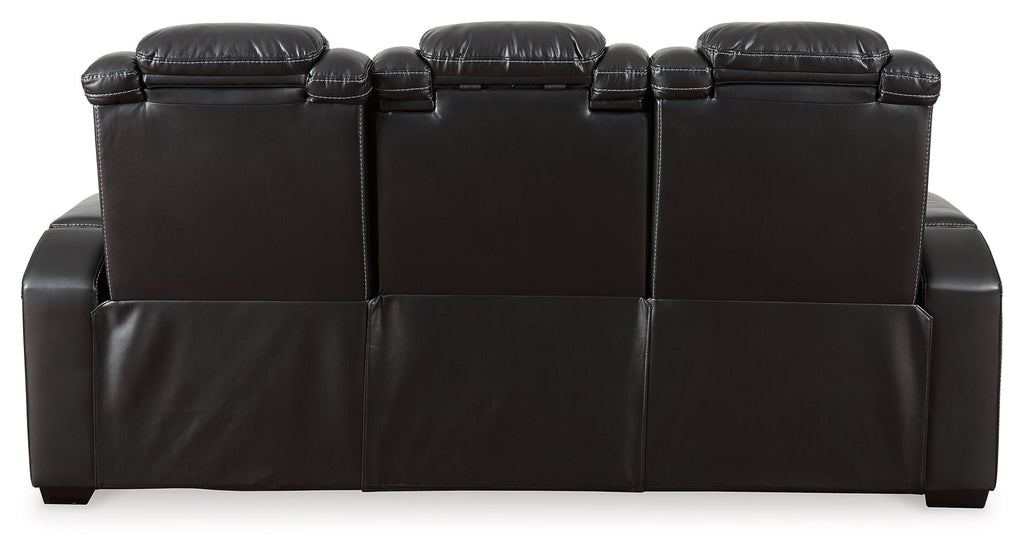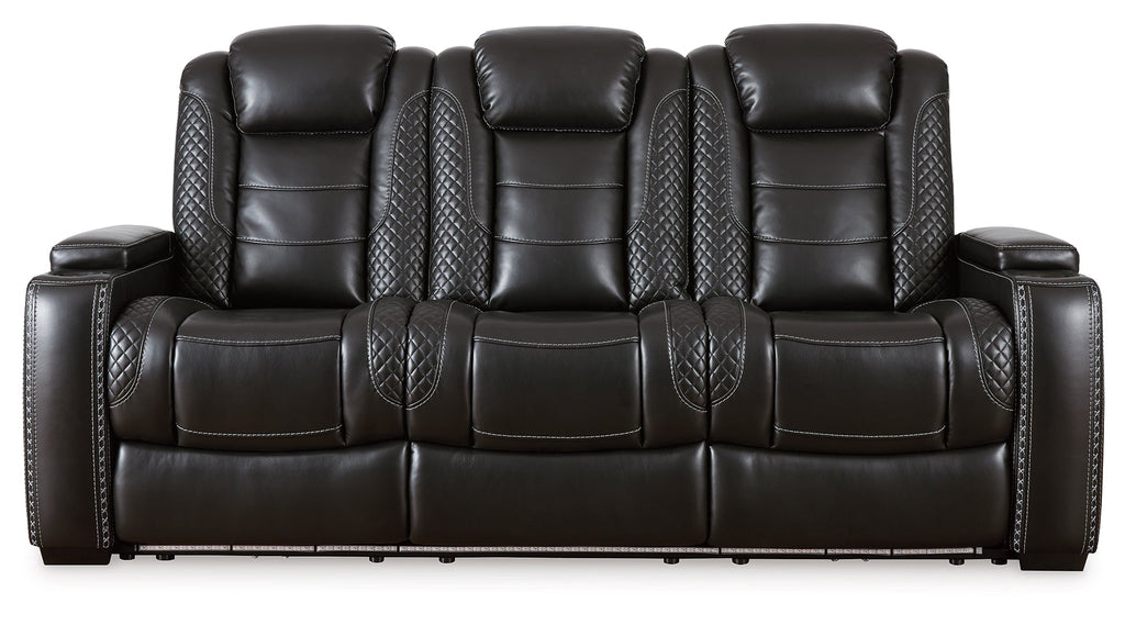 This power reclining sofa takes its cue from luxury automobiles with lattice- and cross-hatch stitching, for a richly tailored aesthetic that gives you plenty of reasons to celebrate. Sumptuously padded cushions and dramatic midnight black faux leather upholstery add to the indulgence. When it’s time to rev up the action, the sofa’s dual reclining bucket seats (middle seat is stationary), Easy View™ power adjustable headrests and center seat that folds down into a table keep you in the driver’s seat.