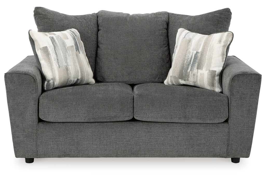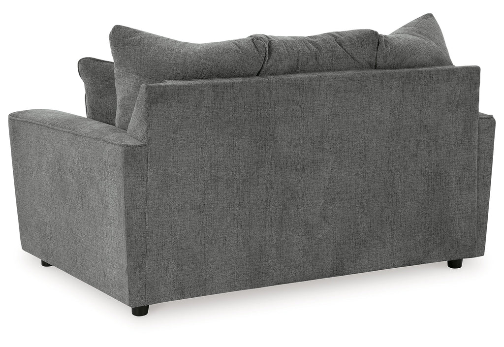 What’s new in neutrals? Shades of gray, of course. Embrace the sophisticated design trend with this gorgeous loveseat, which offers a clean-lined, contemporary style at a comfortably cool price. Sure to lift your spirits, the plush chenille fabric is fabulously neutral. Modern flared arms give it a distinctive flair. This loveseat also arrives with two cool brushstroke accent pillows to elevate the taste and comfort level.