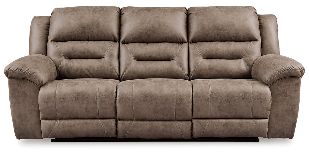 For those who love the cool look of leather but long for the warm feel of fabric, this power reclining sofa delivers both with ease. Its high-performance padded faux leather is remarkably durable and easy to clean, making it just the thing for family spaces. When it’s time to relax, the one-touch power control puts the perfect position at your fingertips. Channel-stitched back cushions provide indulgent lumbar support for maximum seating comfort—not to mention fashion-forward flair.