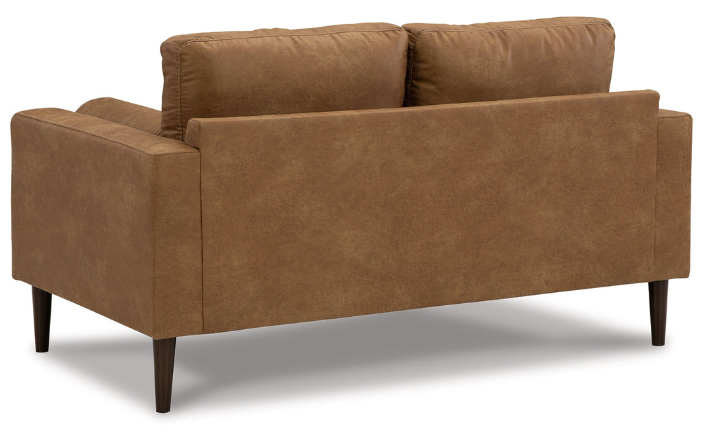 Small-scale style, tailored to perfection. This loveseat echoes retro aesthetics with warm caramel faux leather, while its ultra-linear silhouette incorporates a contemporary edge. Versatile in form and function, the seat suits styles from modern boho to transitional. And its size helps you to confidently curate your compact space without sacrificing comfort (or your budget).