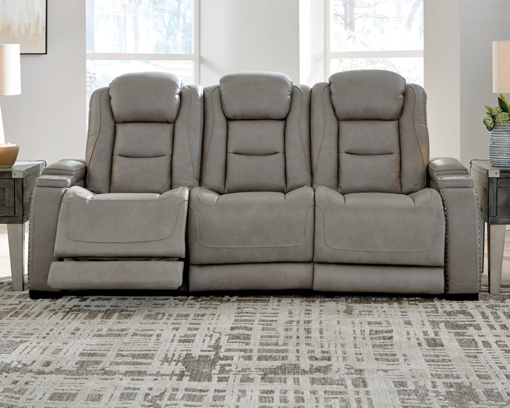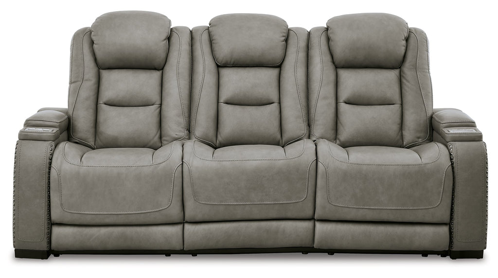 Reserved for him and made for her, this power reclining sofa in gray delivers all the comfort and style you could ask for. Inspired by sports car interiors, the combination leather and faux leather upholstery has a “perforated automotive” treatment for that much more appeal. Positioned at your fingertips, the advanced one-touch power control puts you in the driver’s seat with everything from an Easy View™ power headrest and power lumbar support, to a USB port and wireless charging for your phone. Talk about fully loaded. The middle seat reveals a pull-down table with dimmable reading lights and cup holders. And with integrated cup holders and hidden storage compartments under the posh, padded armrests, this designer power reclining sofa makes the most of every inch of space.