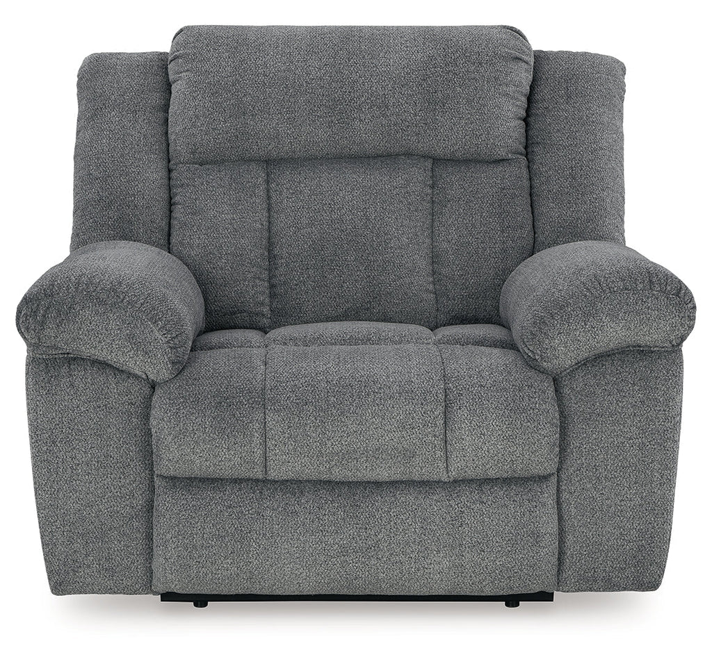 Big, bold comfort. Game time and movie nights meet their match with this power recliner. Made for ultimate indulgence, an extra-deep seat encourages you to sit back and bliss out. Customize the recliner and headrest to find your ideal viewing position with effortless one-touch controls. And with plush upholstery in a trendy hue, you won’t need to sacrifice style for cozy seating.