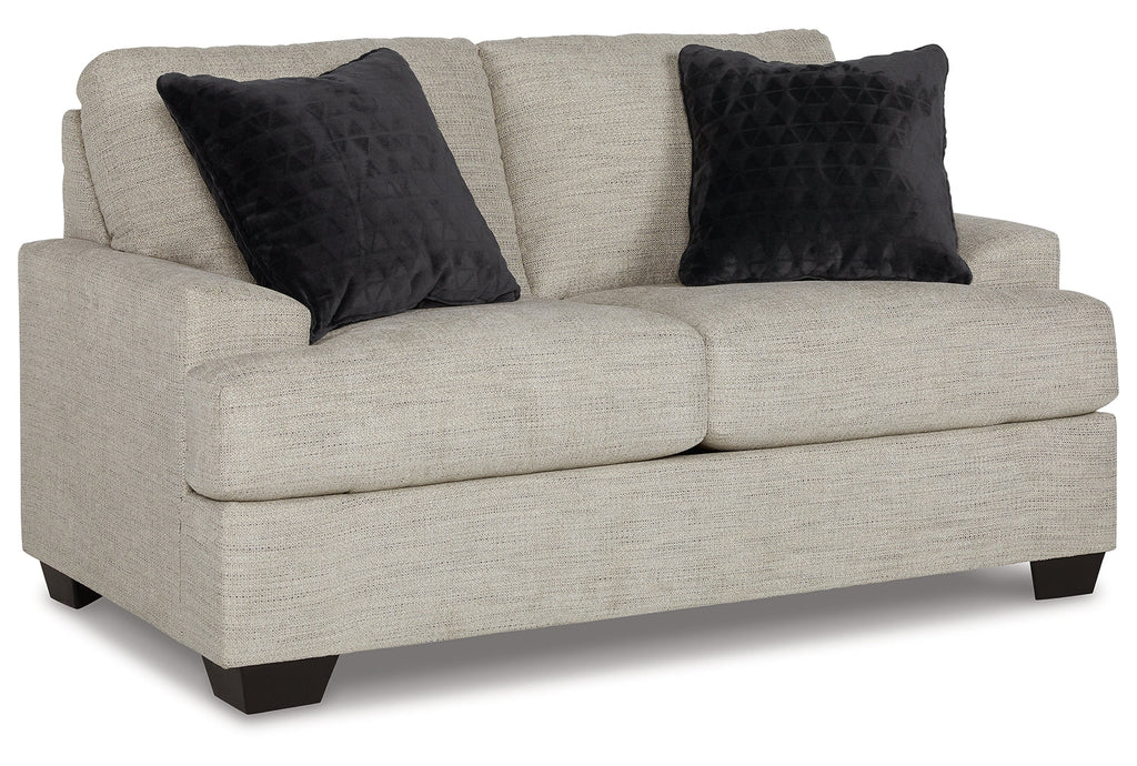 Laid-back luxury meets neutral practicality in this loveseat. Taking its cues from contemporary design, the clean-lined piece is outfitted with angular arms for a layer of geometric expression. Softly upholstered, sizable cushions keep you comfortable, while black faux fur accent pillows bring a touch of soft glam. With this loveseat, winning style and superb functionality go hand in hand.