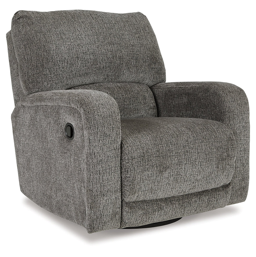 You and plush cushions are two peas in a pod. That’s why this swivel glider recliner will quickly find its way to your heart. Chenille fabric feels so good, you’ll never want to take your hands off of it. Track arms elevate the look with a touch of contemporary sensibility. Ease back into relaxation on the deep seating with one easy pull. Complete with 360-degree swivel, this recliner sets the bar for comfort.