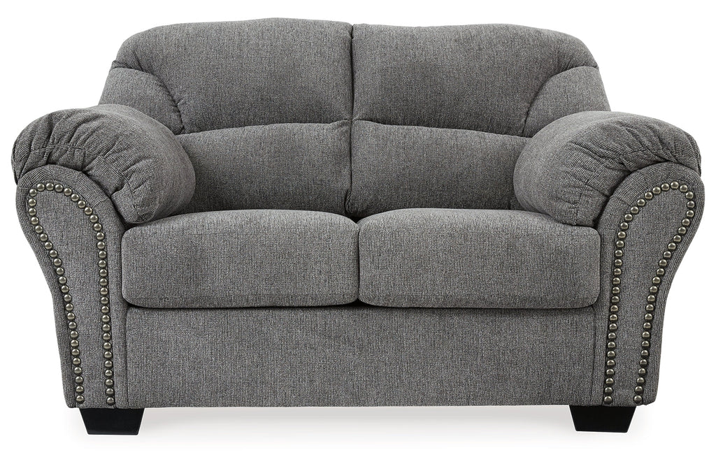 Why sacrifice comfort for style (or style for comfort) when you can have the best of both in this loveseat in pewter gray. Elements include a chic divided-back design and pillow top wrapped armrests that make nodding off all too easy. Calling attention to the elegantly flared armrests—black nickel-tone nailhead trim for a punch of cool character.