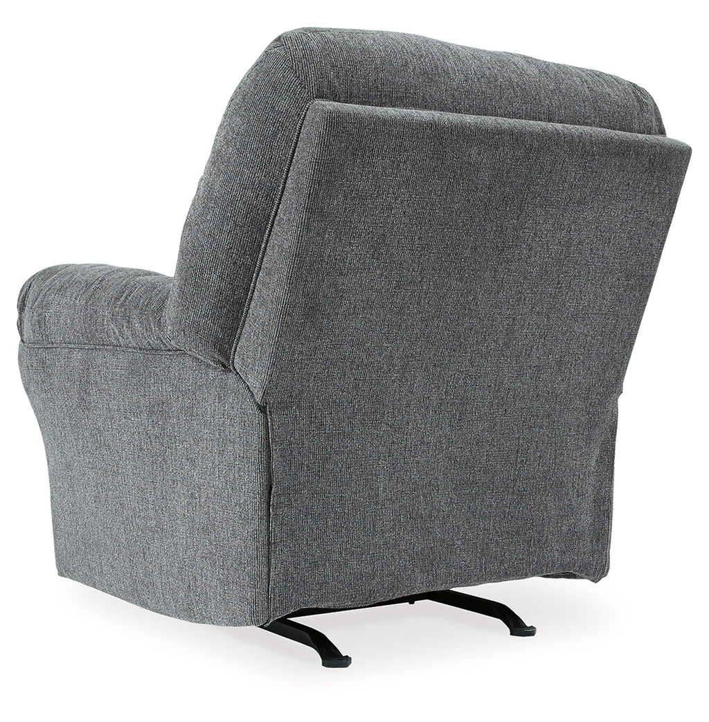 Why sacrifice comfort for style (or style for comfort) when you can have the best of both in this rocker recliner in pewter gray. Elements include a chic divided-back design and pillow top wrapped armrests that make nodding off all too easy. Calling attention to the elegantly flared armrests—black nickel nailhead trim for a punch of cool character.