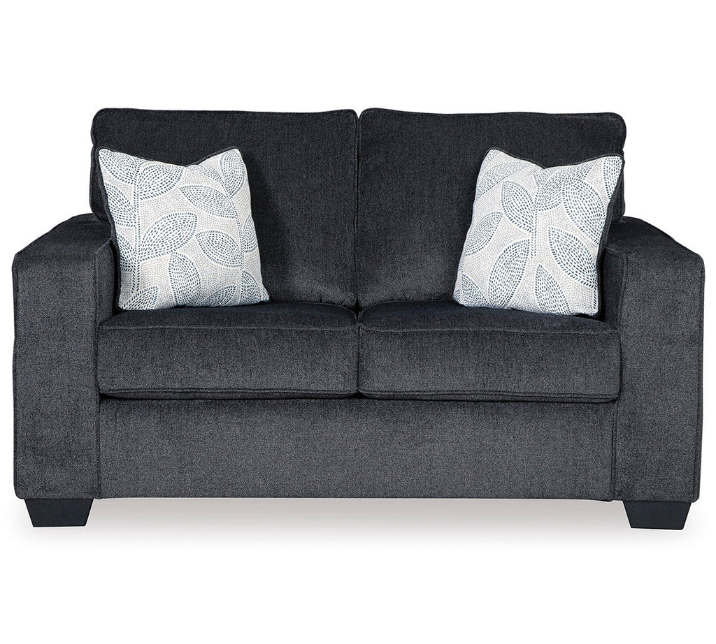 If style is the question, then this loveseat is the answer. Sporting clean lines and sleek track arms, the decidedly contemporary profile is enhanced with plump cushioning and a chenille-feel upholstery that's so pleasing to the touch. Sure to play well with so many color schemes, this loveseat in slate gray includes a pair of understated floral pattern pillows for fashionably fresh appeal.