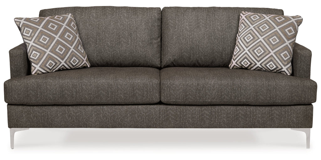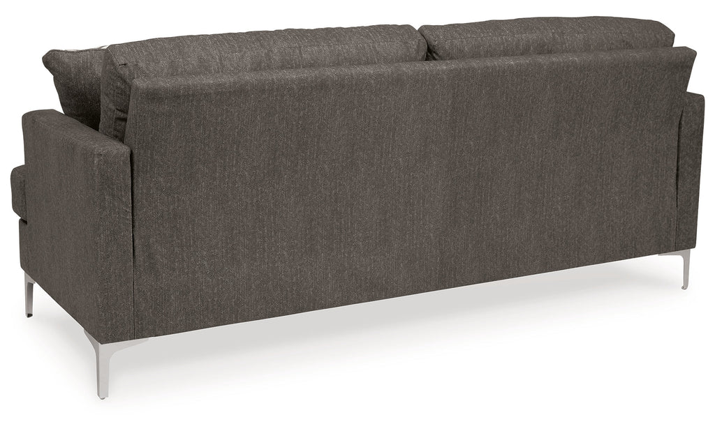 If modern subtlety is your style, settle into the heavenly texture of this sofa. The tremendously soft upholstery has a slight herringbone pattern that adds depth and richness to the java color. The metal accent legs elevate this piece as well as the style of it and add a decidedly chic sense to your space.