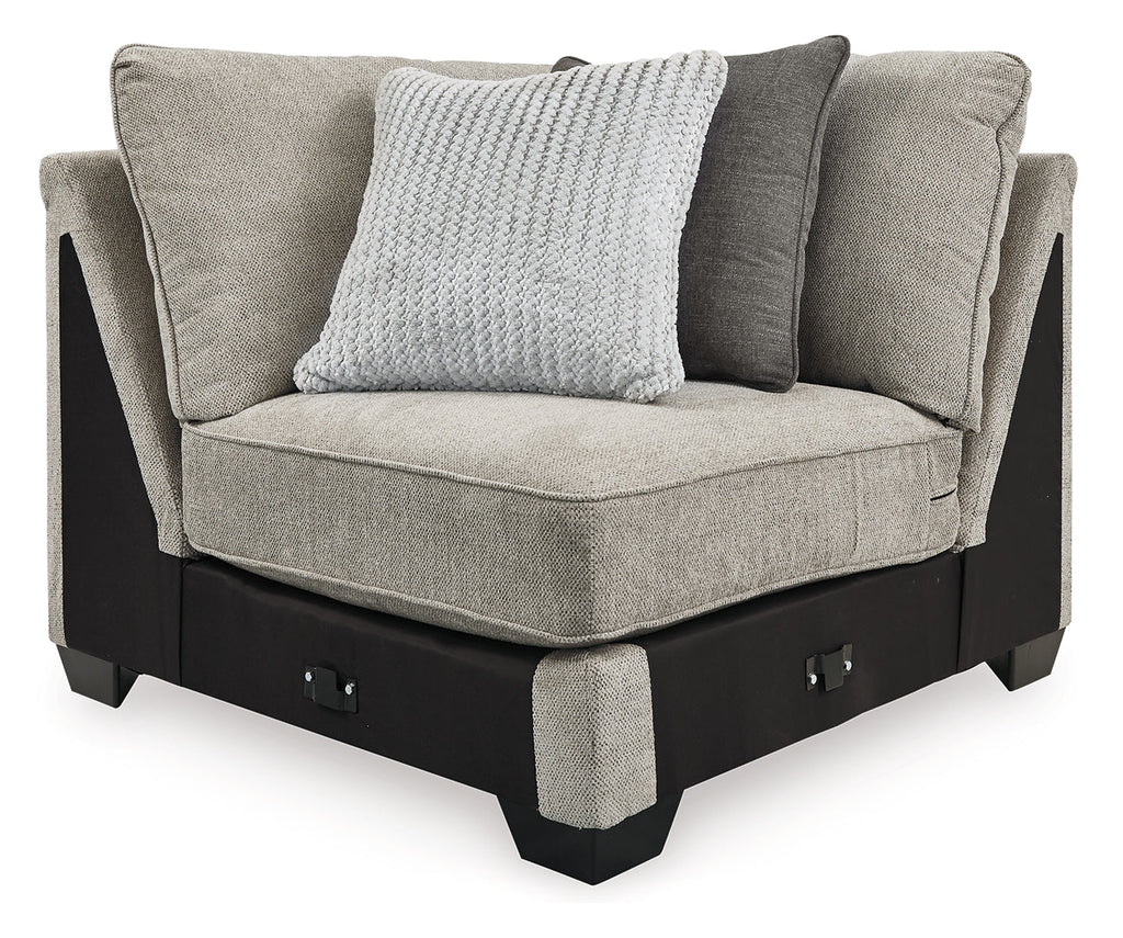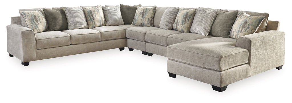 - Includes 5 pieces: right-arm facing corner chaise, armless loveseat, armless chair, left-arm facing sofa and wedge