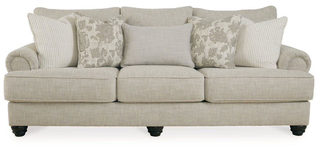 This sofa has an alluring look that's guaranteed to turn heads. Richly textured fabric in a light, easygoing hue is enhanced by even lighter flax peeking through. Distinctive roll arms add a dab of debonair, while indulgently plush cushions cradle you softly. Sit back and relax in comfort and style, with plenty of room to stretch out and unwind at the end of a long day.