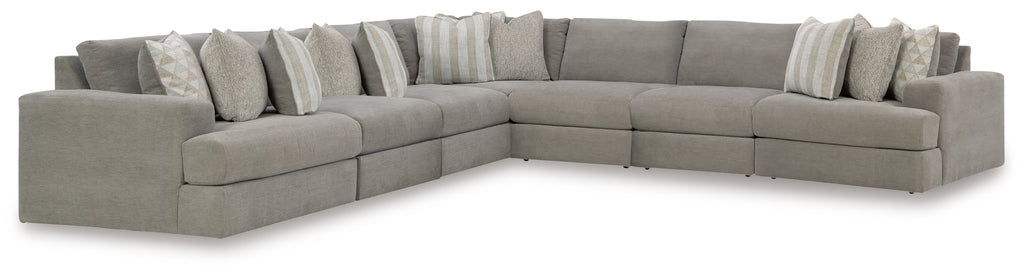- Includes 6 modular pieces: left-arm facing corner chair, 3 armless chairs, wedge and right-arm facing corner chair