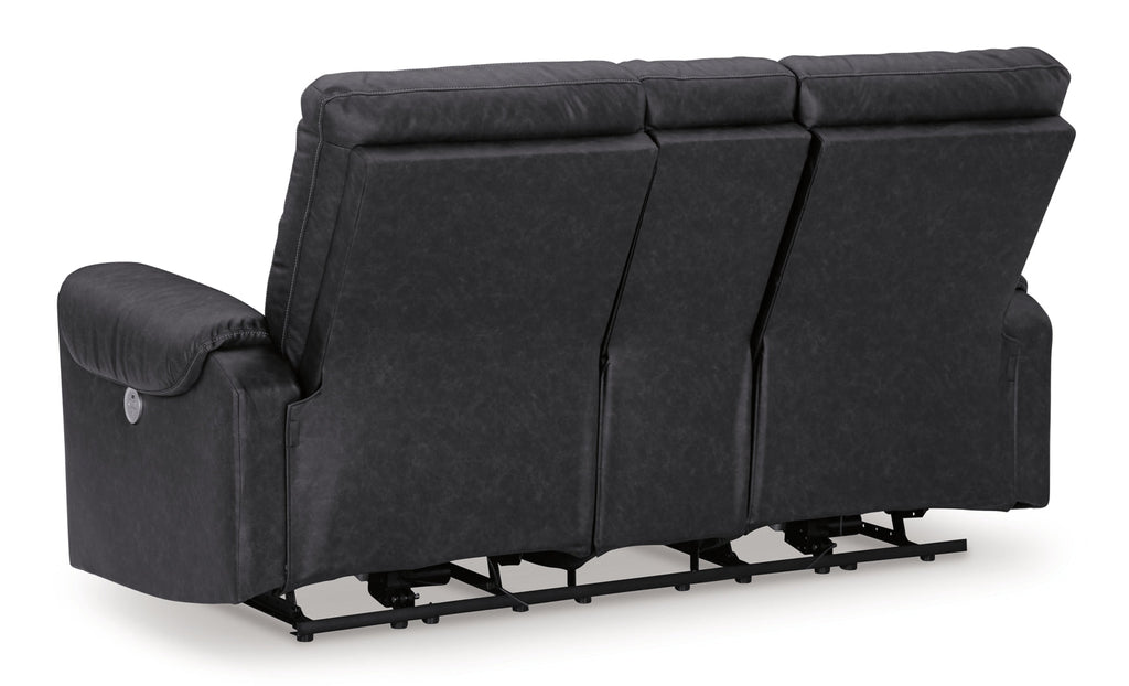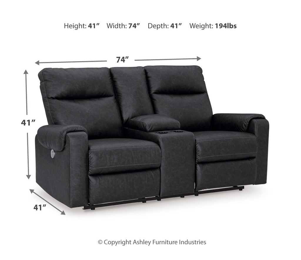 You don’t just want to recline. You want to recline in high design. This power reclining loveseat’s clean lines and supple faux leather are out to capture your heart with style and comfort. Easily tuck away remotes or gaming controllers and keep drinks close by with its handy console. This loveseat gives you the upscale look you want for less—simply take a seat, raise your legs and relax.