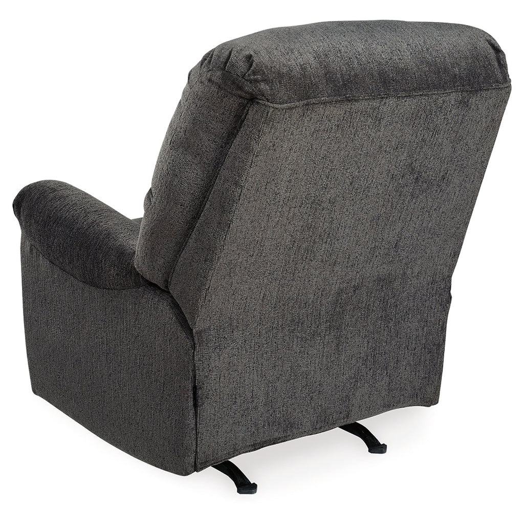 A mastery in "less is more," this rocker recliner manages to make cool, contemporary design so warm and cozy. Its smoky gray upholstery, incredibly plush to the touch, is a new twist on neutral. A curved divided back and a deeply tufted footrest give the clean-lined profile a sense of sumptuousness that's impossible to resist.