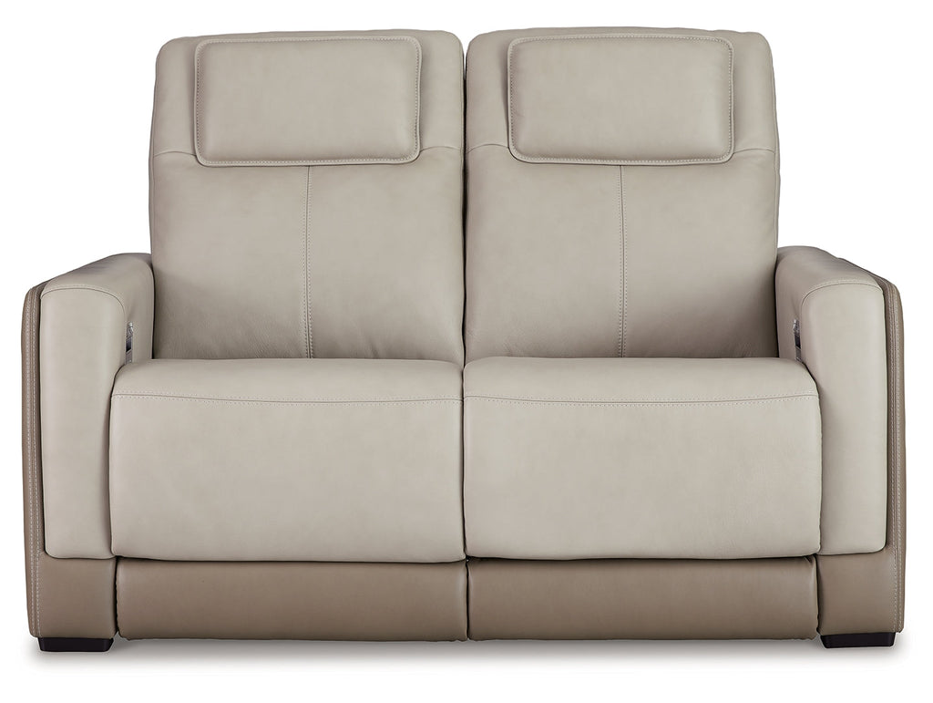 Double down on sleek style with this power reclining loveseat. It has a streamlined, space-conscious appeal, with two-tone upholstery in neutral hues creating subtly striking visual intrigue. And with one-touch reclining, adjustable headrests and wireless charging, this piece combines contemporary function and fashion into a single clean-lined design.