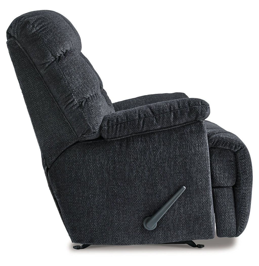 Sit back, relax and kick up your feet. Immerse yourself in total comfort as this rocker recliner embraces you with the cool look of leather and the warm, cozy feel of fabric. Plush, pillowy cushions, an oversized headrest pillow and wide pillow top armrests feature heavyweight stitching in a delicious mocha hue. The warm, welcoming look fits easily with other colors in the room and is right at home with a variety of design styles. A comfortable big and tall high-back profile allows an abundance of softness that is over the top.