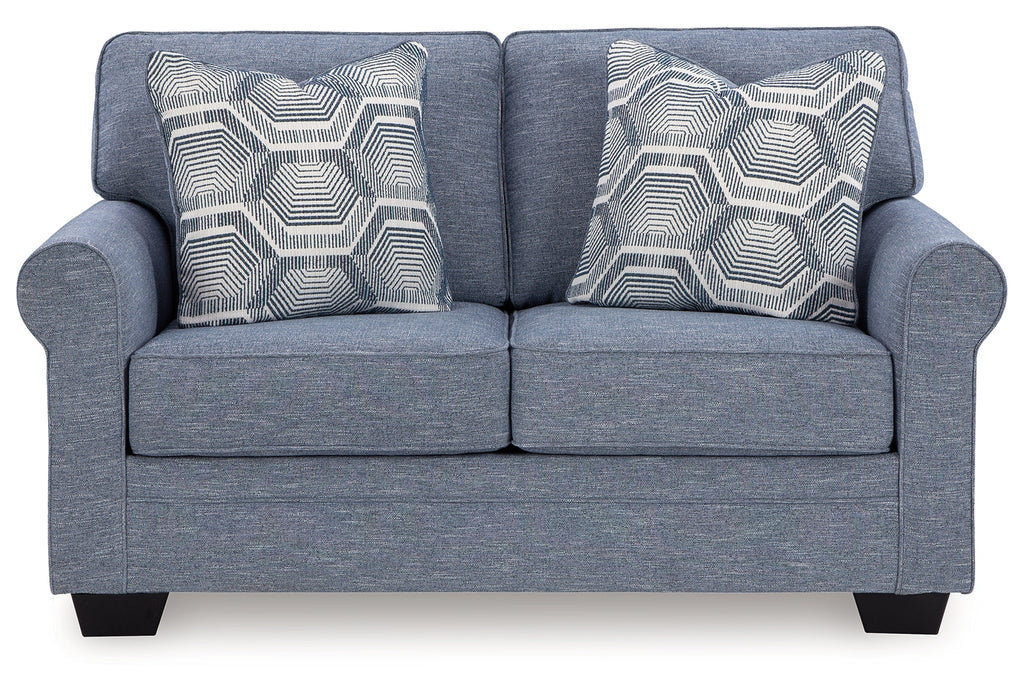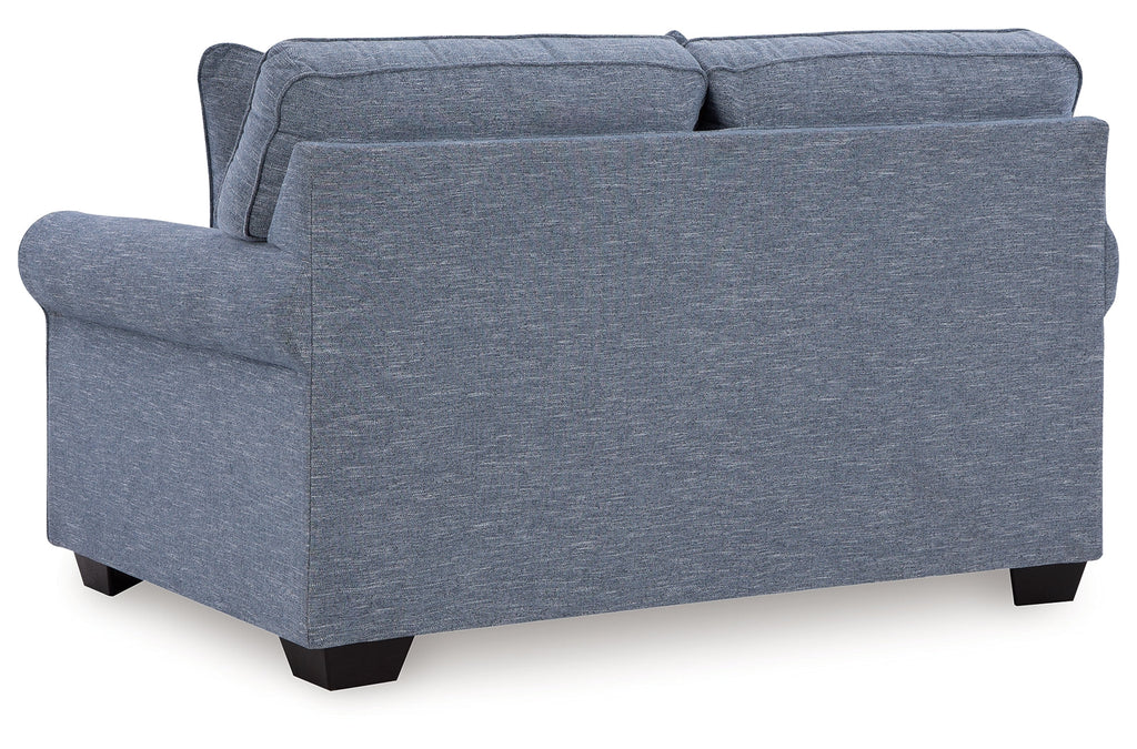 This loveseat is defined by comfort, convenience and classic style. Soft to the touch and stain-resistant, the family-friendly Next-Gen Nuvella™ fabric is easy to maintain. And you'll love the universal appeal of its denim-inspired hue. With roll arms adding a dash of traditional flair, the loveseat is a simply chic approach to everyday relaxation.