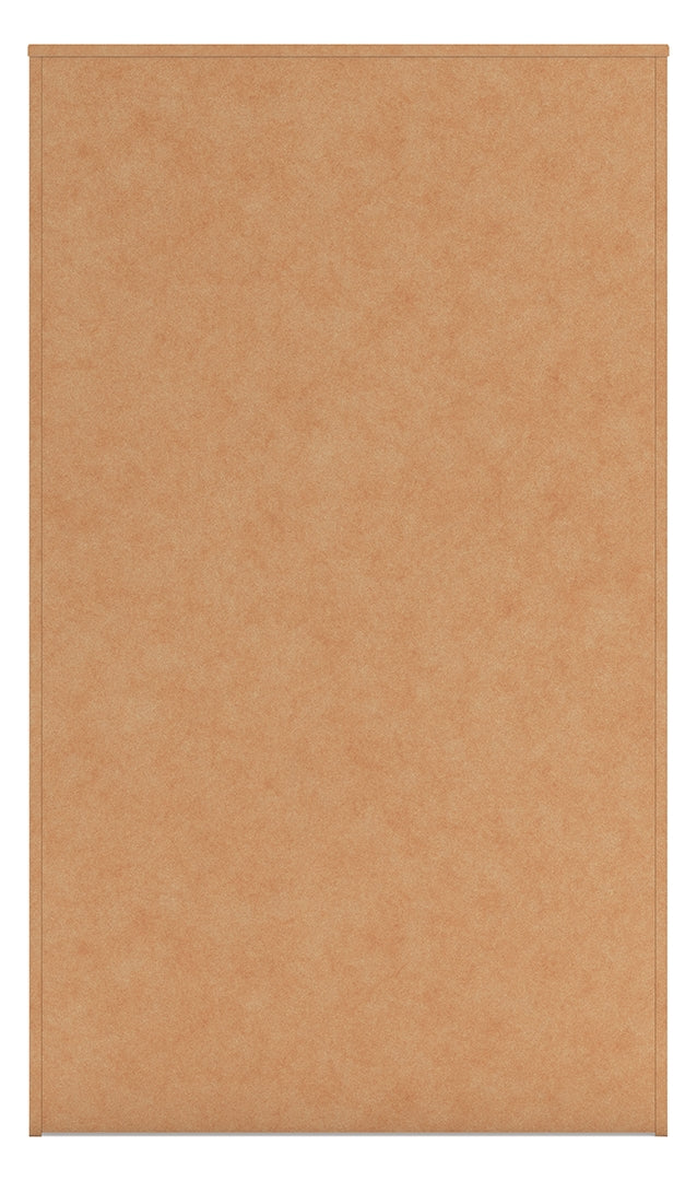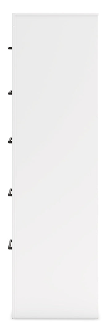 Relaxed yet striking, this chest of drawers brings casual beauty and function to your dream destination. You're sure to love its five spacious drawers that glide open and offer plenty of storage for your wardrobe and spare bed linens. A delightful two-tone treatment blends a fresh replicated oak grain with a matte white finish, while sleek handles in an antiqued gunmetal finish lend a contemporary touch.