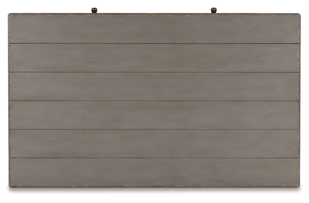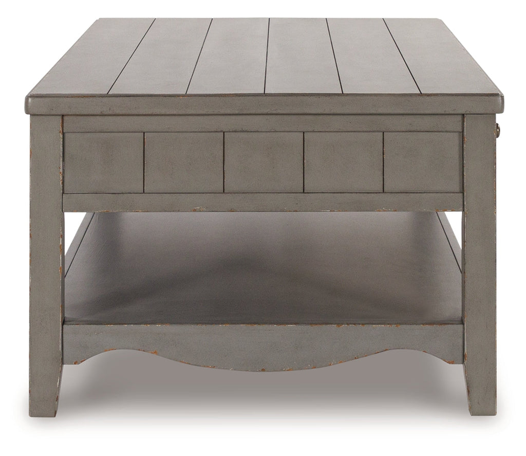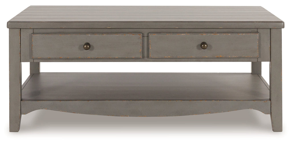 Put your love of European farmhouse styling on display. Finished with an antiqued gray chipped paint effect for an authentic vintage look, this coffee table is loaded with character. Two drawers and an open display shelf allow for storage and easy access to books, beverages and more.