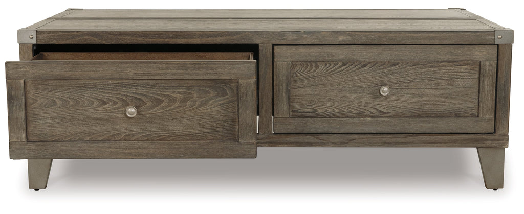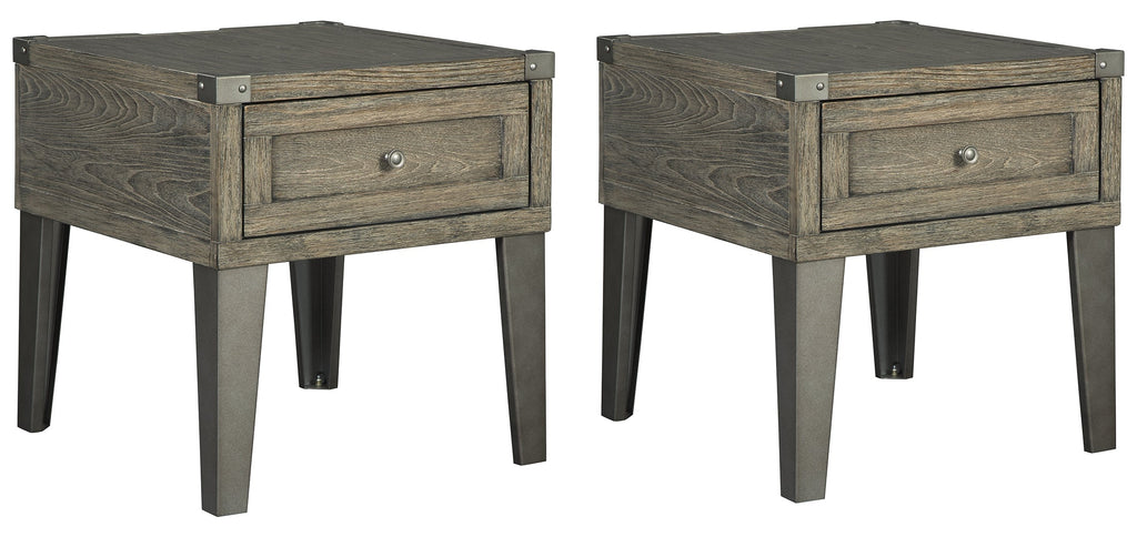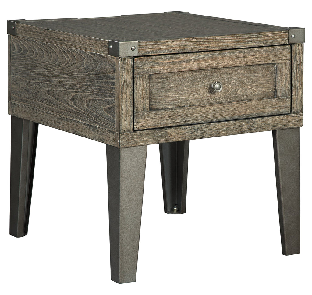 Celebrating the lighter side of modern industrial style, this 2-piece end table set is the best in form meets function. The table’s less-is-more weathered finish allows the natural wood grain to take center stage. Metal bracket accents and tapered metal legs in a silvertone finish are a cool yet refined touch. A smooth-gliding drawer offers plenty of handy storage.