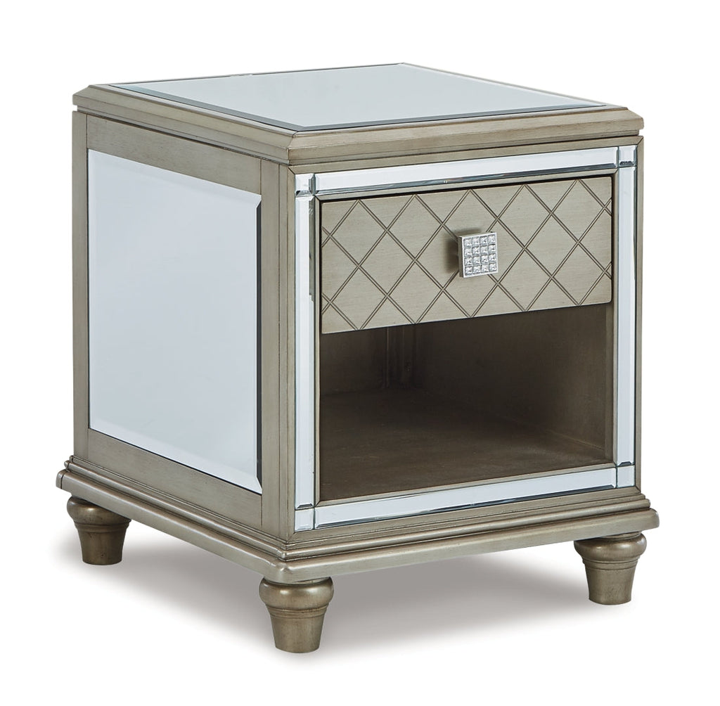Glamorous, chic and sophisticated. This accent table set is made of solid wood with a metallic silvertone finish, with inset beveled mirror panels and inset drawer pulls adorned with faux crystals. This set is a stunning addition to your contemporary decor.