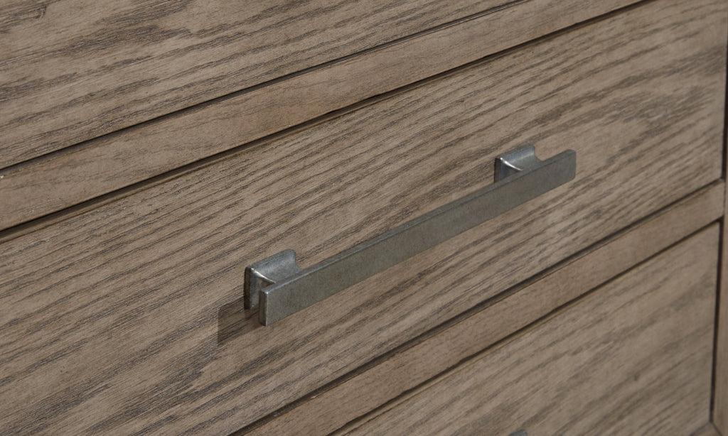 You want your room to reflect your refined sensibilities while remaining forward-thinking in design. The simple silhouette of this chest of drawers opens the door to a bedroom with the curated look and subtle flair you desire. Striking metal bar pulls in a light pewter tone are functionally fashionable against the piece's elegant waxy gray finish. Ample drawer space allows you to store in streamlined style.