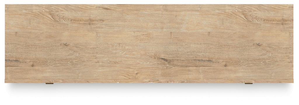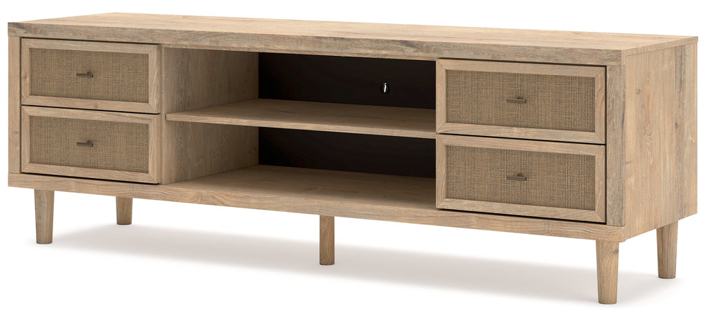 Clean-lined and contemporary—but far from stark—this TV stand is a fresh style awakening. Pairing a light finish with replicated oak grain and textured beige cane details, its mixed materials bring a naturally versatile vibe to your favorite spot for binge-watching or gaming. Sleek, simple hardware plays perfectly with the modern aesthetic. And prepare to have your mind blown by the vast universe of storage possibilities within the spacious drawers and open shelving.