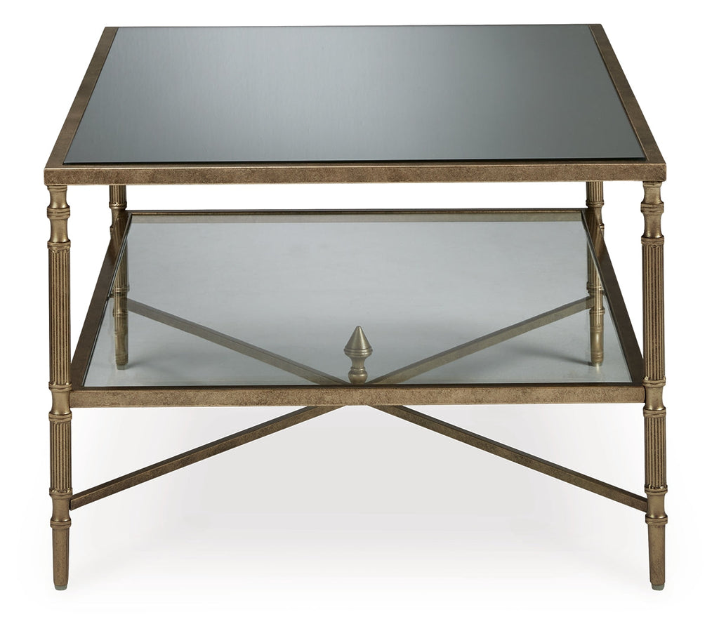 This occasional table package gives traditional design a wonderful sense of relevance. Its details, which include embellished legs and stretchers with a decorative center finial, are timeless classics. The aged goldtone coloration is the essence of relaxed elegance. Underlying shelves add style, substance and functionality.