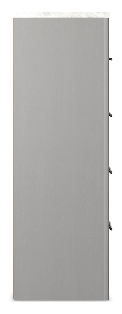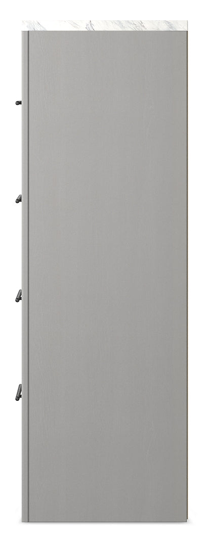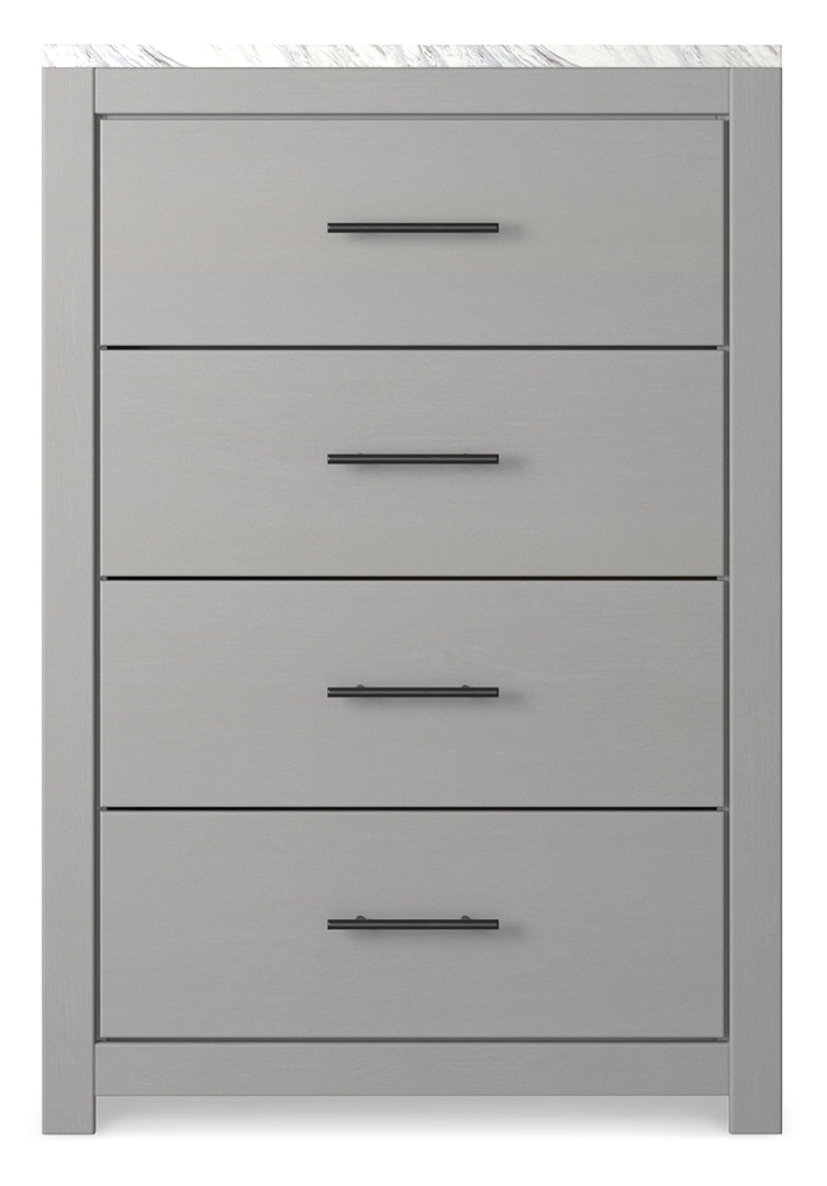 Cool, clean and casually modern. This chest’s wispy dove gray finish and faux Calcutta marble top set the tone for your calming sanctuary. Large linear pulls add dimension and authenticity. Four smooth-gliding drawers neatly accommodate your wardrobe needs.
