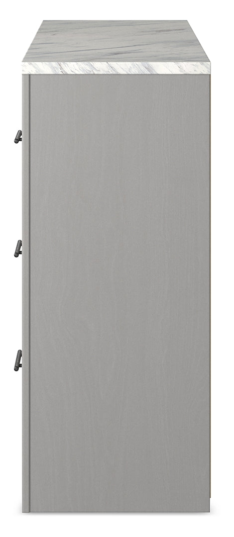 Cool, clean and casually modern. This dresser’s wispy dove gray finish and faux Calcutta marble top set the tone for your calming sanctuary. Large linear pulls add dimension and authenticity. Six smooth-gliding drawers neatly accommodate your wardrobe needs.
