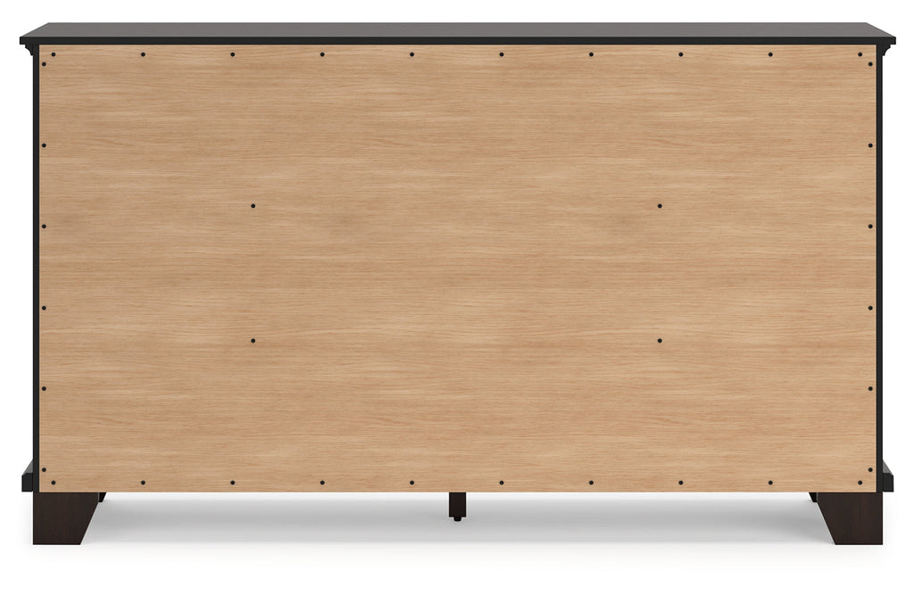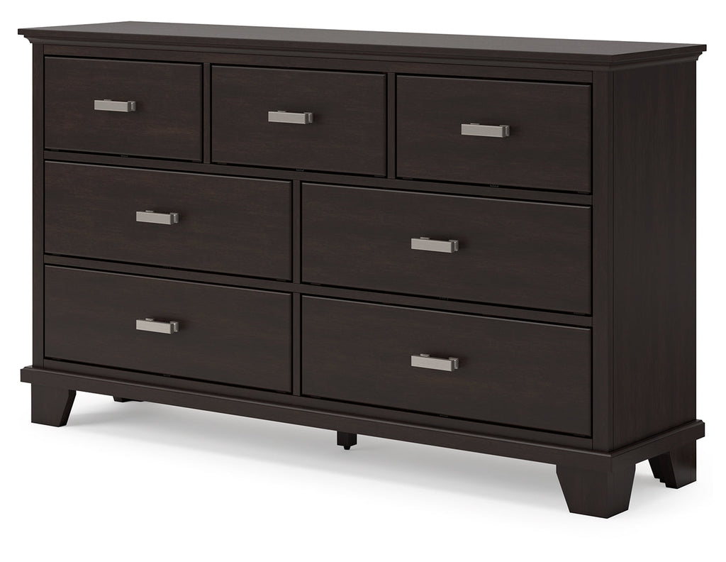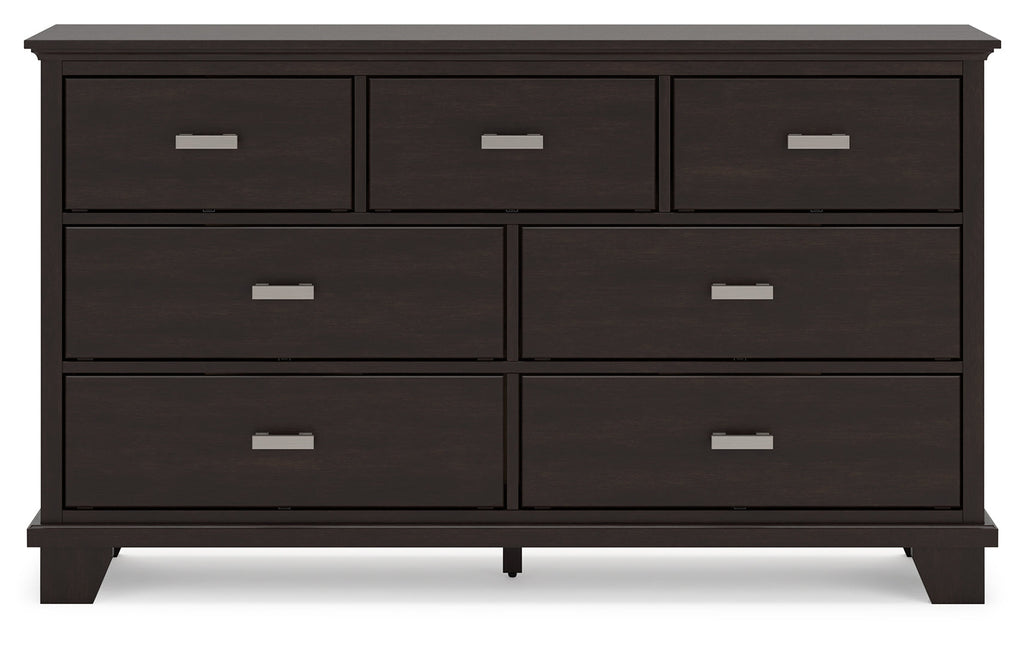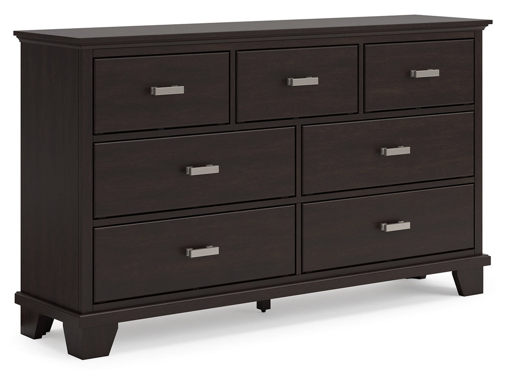 Feast your eyes on this richly versatile dresser. Its traditional-inspired dark brown finish effortlessly blends with contemporary bright nickel-tone pulls to create a stunning look that's not too stuffy or too trendy. Spacious drawers offer plenty of storage for your wardrobe and spare bed linens.