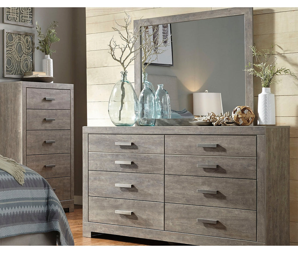 This dresser and mirror's weathered driftwood finish evokes such an ethereal vibe—exactly what you need for your serene master suite. Clean lines and simple yet substantial hardware make for a timeless look you’ll love living with for years to come. Six spacious drawers offer ample storage for a wardrobe and spare bed linens.