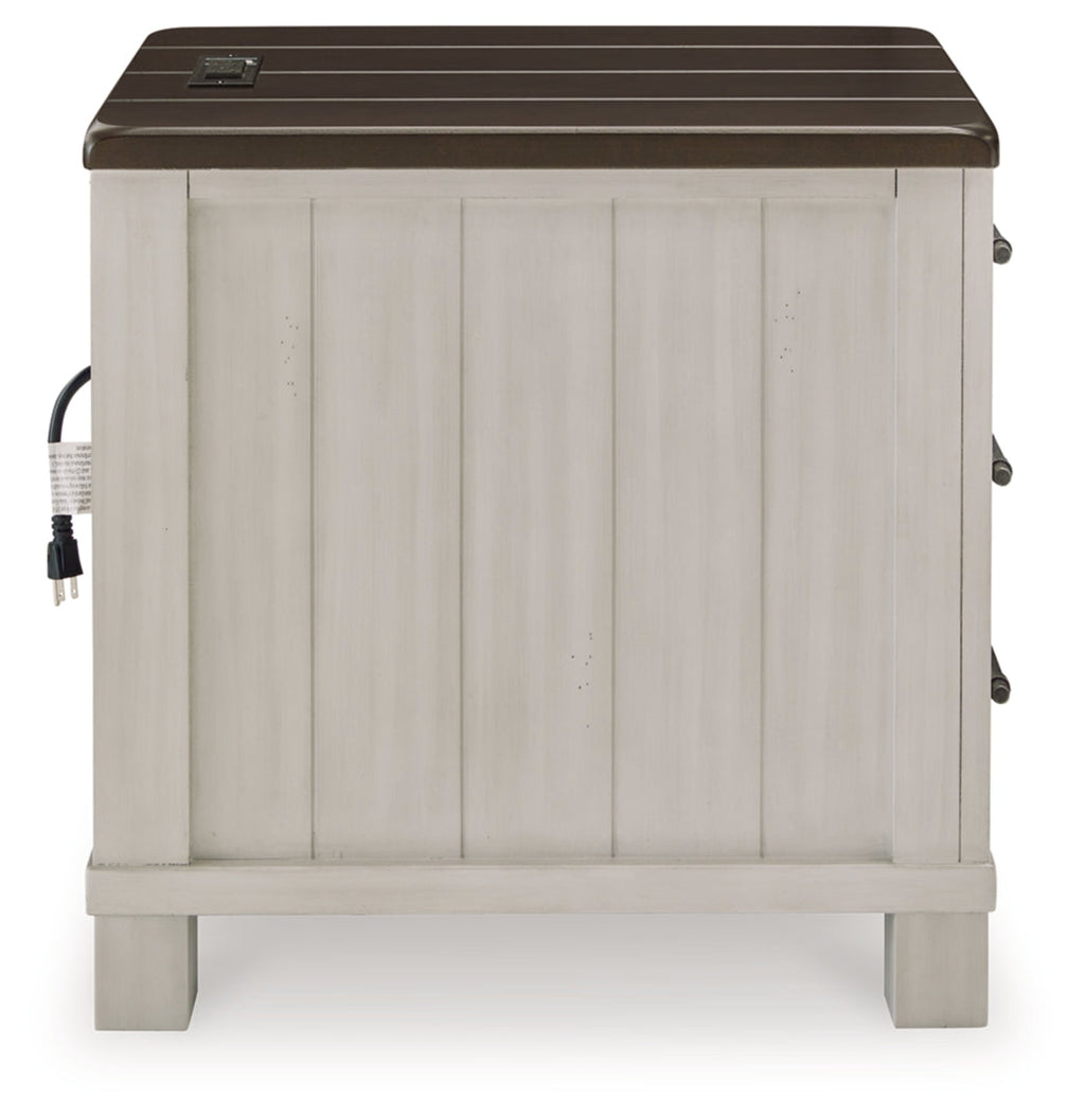Make a farmhouse-inspired statement with this end table. Beautifully crafted to stand the test of time, the planked effect and clean two-tone finish lend a relaxing vintage feel. Spacious storage drawers with metal pulls double up on form and function. Plus, this end table's dual USB charging ports keep up with your high-tech lifestyle.