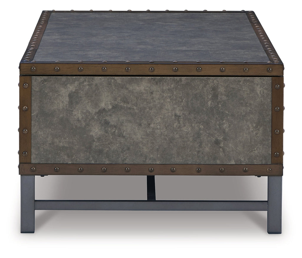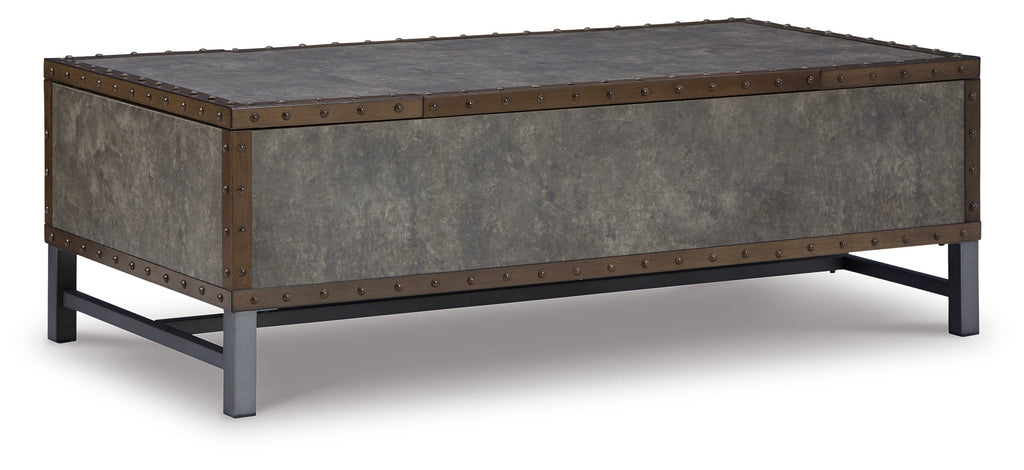 Reinvented for the here and now, this lift-top coffee table rocks vintage industrial design with a traditional vibe. Its metal accent trim and bronze-tone metal base frame are ready to embrace the modern demands of everyday life. Two spacious storage bins provide additional storage, while the center lift top transforms into a casual work center or extra dining space when needed.