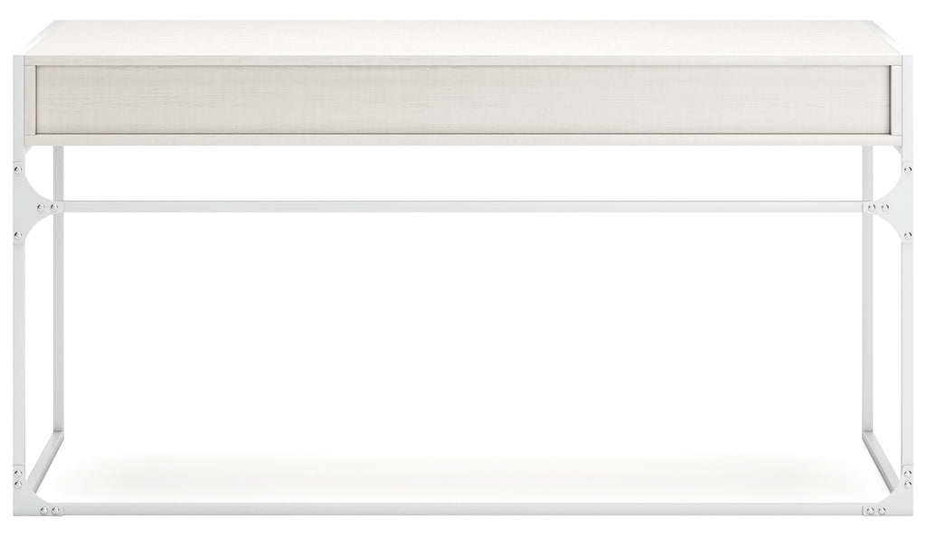 Bring your vision of a modern home workspace to life with this sleekly designed home office desk. Its linear construction and white finish keep things minimal. Two drawers with goldtone hardware round out the versatile, striking desk.