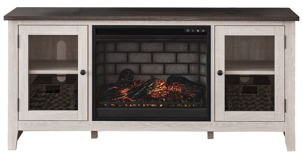 With its two-tone finish and minimalist charm, this TV stand with infrared fireplace insert is right in tune with your relaxed approach to high style. Beautifully made to accommodate your media equipment, it’s well equipped with adjustable shelving, cutouts for wire management and a pair of glass-front doors that enhance the clean-lined aesthetic. The look is ideal for modern farmhouse and contemporary settings. What really turns up the heat: an electric infrared fireplace insert with faux firebrick surround that operates with or without infrared heat. With the touch of a button, adjust the temperature and the flame brightness, and set the timer for long-lasting enjoyment.
