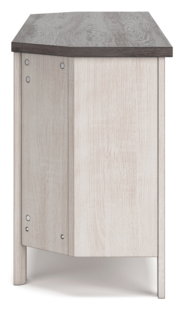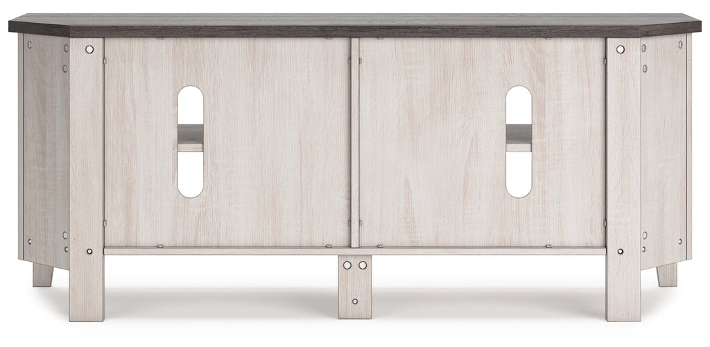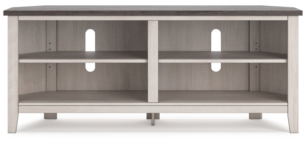 With its minimalist charm, this TV stand is right in tune with your relaxed approach to high style. Beautifully shaped to nestle into any corner, it’s well equipped with a flexible open-concept design and cutouts for wire management that enhance the clean-lined aesthetic. The look is ideal for modern farmhouse and contemporary settings.