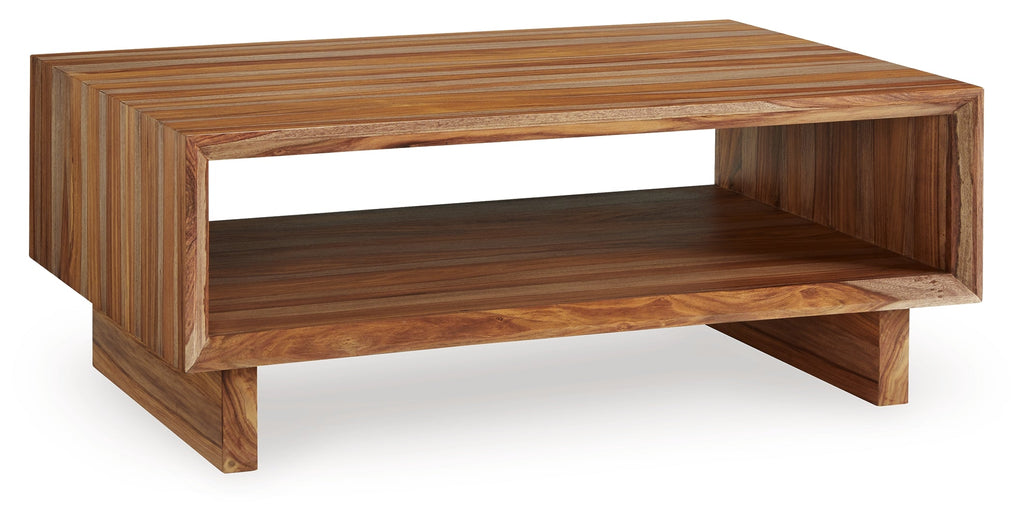 Discover something extraordinary with this clean-lined coffee table. The rich natural beauty of the wood, enhanced with a clear wood-tone finish, brings an organically stunning vibe to your seating area. Strikingly simple lower shelving displays your favorite decor in utterly chic style.