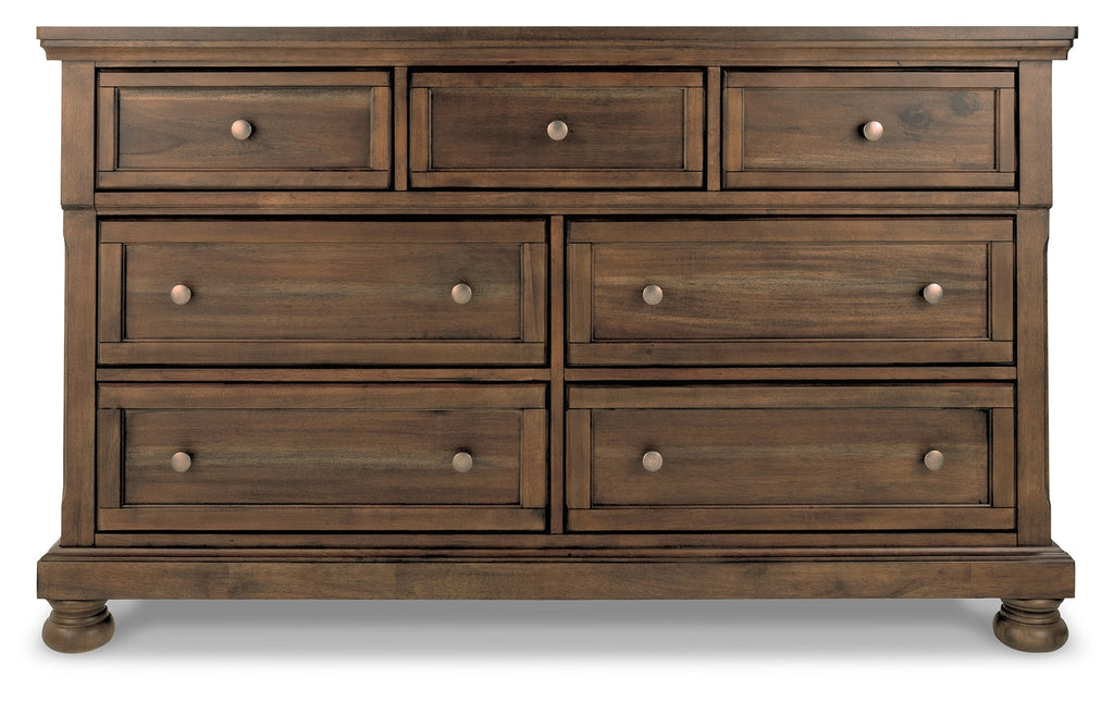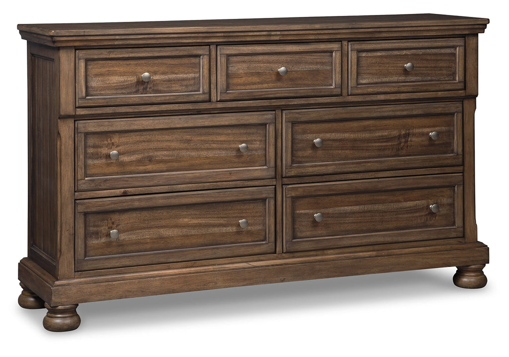 A fresh, new take on traditional style. This dresser meets today’s design tastes with beauty and grace. Its tobacco brown finish allows the natural grain of the acacia veneers to show through in an organic way. Aged brass-tone knobs dress the fronts of the roomy drawers. A hidden pull-out tray behind the top middle drawer puts your small valuables out of sight. This is a look you can appreciate for years to come.