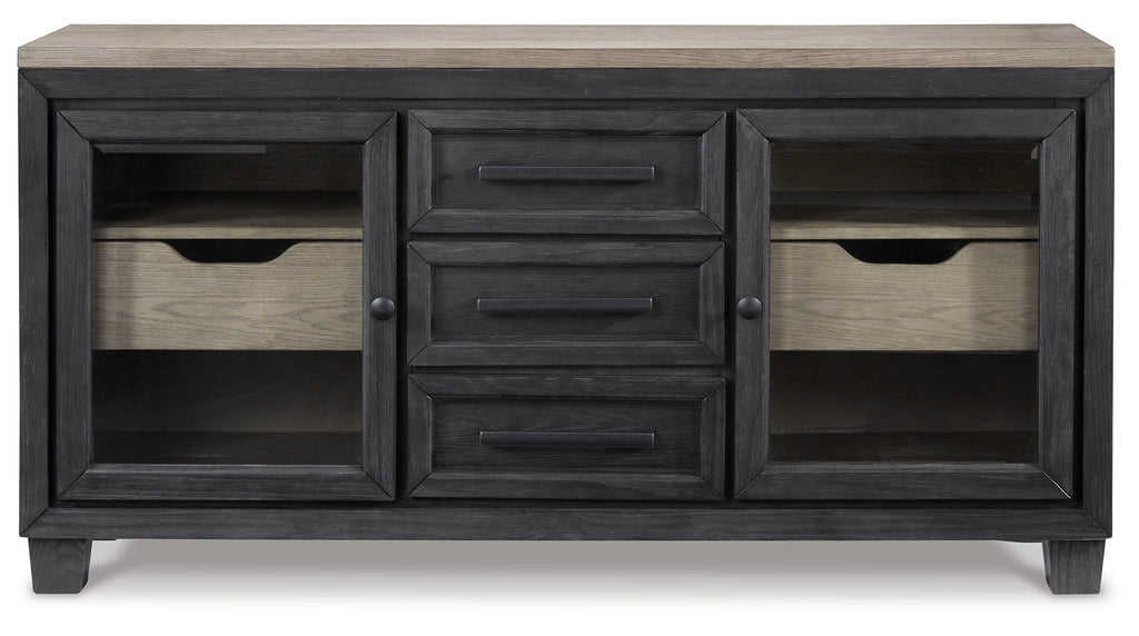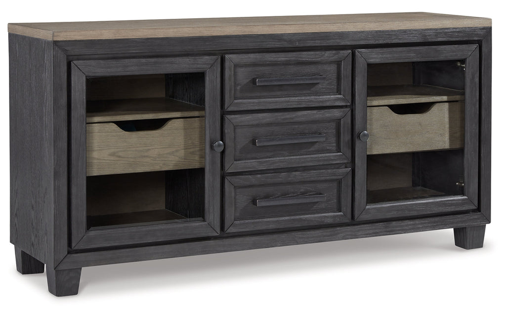 This dining room server is casual contemporary style simply done right. Its two-tone color scheme features rich brushed black main color accented with a beautiful dusty grayish brown wood tone. The versatile piece features three center drawers and two more tucked neatly behind the doors, offering plenty of space to serve your storage needs with ease.