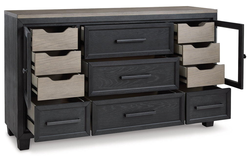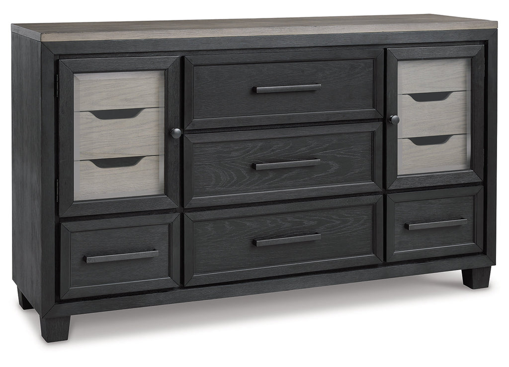 This dresser is casual contemporary style simply done right. Its two-tone color scheme features a rich brushed black main color accented with a beautiful dusty grayish brown wood tone. With 11 soft-close drawers (three located neatly behind each door) this dresser offers plenty of storage to accommodate your wardrobe needs with ease.