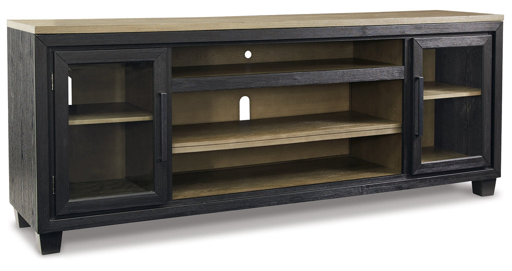 This TV stand with fireplace option is rustic, casual contemporary style simply done right. Its two-tone color scheme features a rich brushed black finish accented with a dusty grayish brown wood tone. With two glass-front cabinets (each with an adjustable shelf), an open cubby and a removable center shelf, it offers plenty of storage to house all of your electronic needs. Compatible with W100-12 electric LED fireplace insert (sold separately).