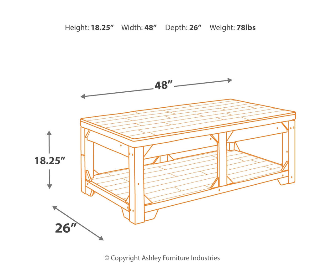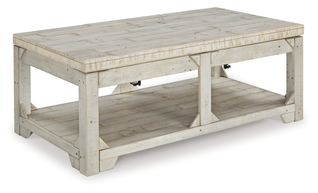Take in the country fresh look of this lift top coffee table and reminisce of a simpler time. Its farmhouse style is evident in its stocky design with planked top/bottom shelf, unique triangle accents and relaxed white washed finish. With a handcrafted look thanks to reclaimed wood, you'll love the casual feel this piece brings to your living area. Plus, easy lift top feature accommodates eating or working in front of the television.