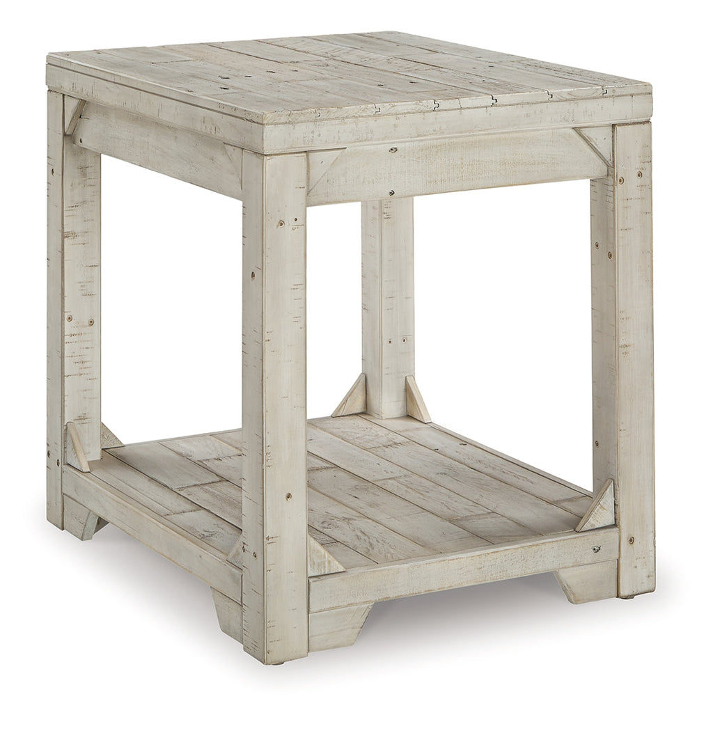 Take in the country fresh look of this end table and connect with a simpler time. Its farmhouse style is evident in its stocky design with planked top/bottom shelf, unique triangle accents and relaxed white washed finish. With a handcrafted look thanks to reclaimed wood, you'll love the casual feel this piece brings to your living area.