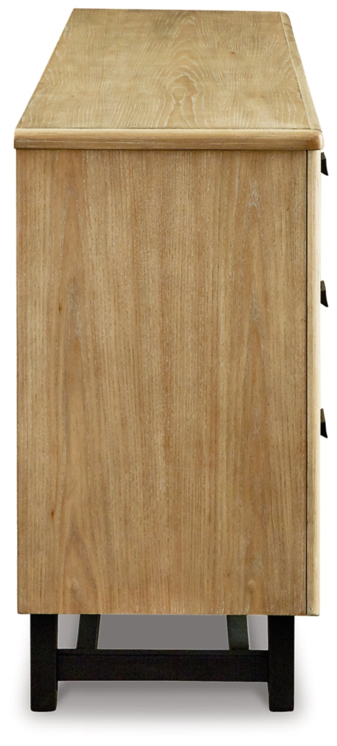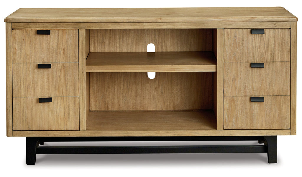 The fresh, organic look of this TV stand has a simple feel that complements your clean and cozy living room with ease. The natural tone has casual sensibility, while matte black legs add contemporary flair. Two side cabinets with doors and adjustable shelving provide prime storage space. The handy open center cabinet can be used for additional storage or as the home for a fireplace insert (sold separately).