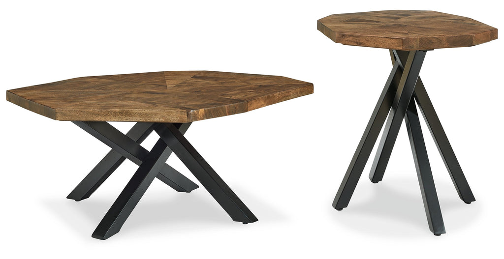 A breath of organic beauty for the contemporary home. This occasional table package works well in conversation with your curated furnishings, with irregular starburst pattern tops and black metal bases bringing a refined touch to natural stylings.
