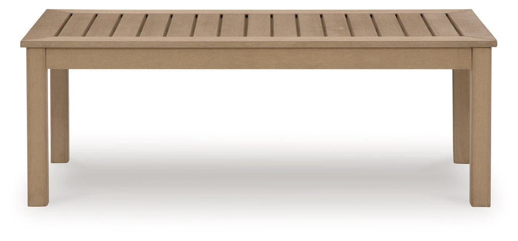 This coffee table is a beautiful addition to any outdoor living space. Effortless in its simplicity, this piece echoes your easygoing sensibilities. Combining durable, cutting-edge engineered materials, its Weatherwood construction in a blond wood color enhances the contemporary design. Pair this table with the matching sofa and chairs for a spectacular backyard or patio seating arrangement.