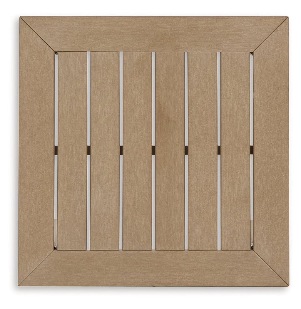 This end table is a beautiful addition to any outdoor living space. Effortless in its simplicity, this piece echoes your easygoing sensibilities. Combining durable, cutting-edge engineered materials, its Weatherwood construction in a blond wood color enhances the contemporary design. Pair this table with the matching sofa and chairs for a spectacular backyard or patio seating arrangement.