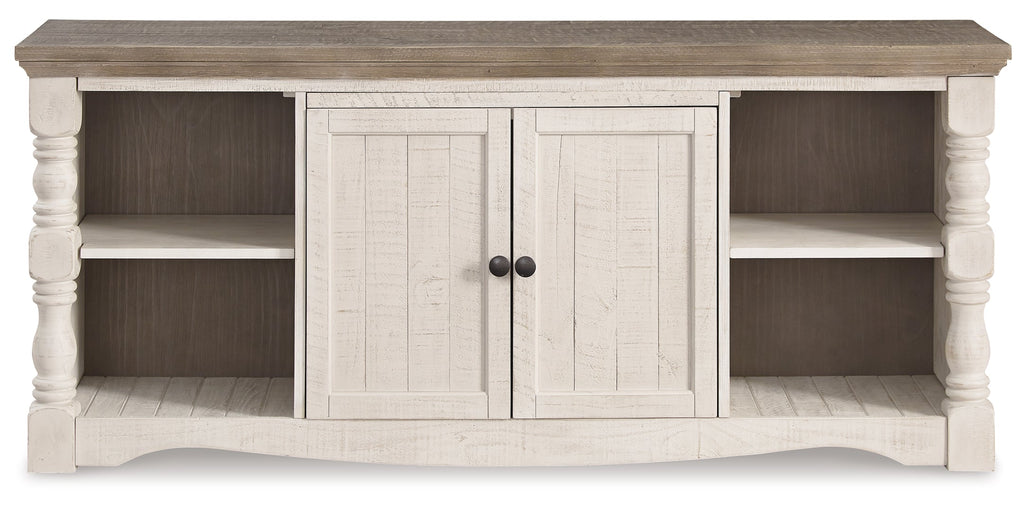 Set your sights on modern farmhouse style with this entertainment center. Distressed two-tone treatment blends a weathered gray with vintage white for an utterly charming effect. Turned posts lend a hearty, substantial look that feels right at home, while plenty of open shelving makes the aesthetic anything but heavy.